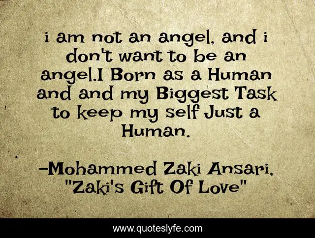 This page presents the quote "i am not an angel, and i don't want to be an angel.I Born as a Human and and my Biggest Task to keep my self Just a Human.". Author of this quote is Mohammed Zaki Ansari, "Zaki's Gift Of Love". This quote is about world, life, love, humanity, affection,.