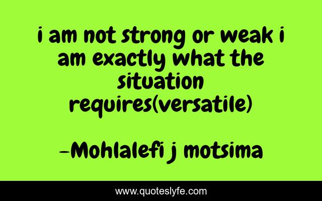 This page presents the quote "i am not strong or weak i am exactly what the situation requires(versatile)". Author of this quote is Mohlalefi j motsima. This quote is about requirements, strong, weak, versatile,.