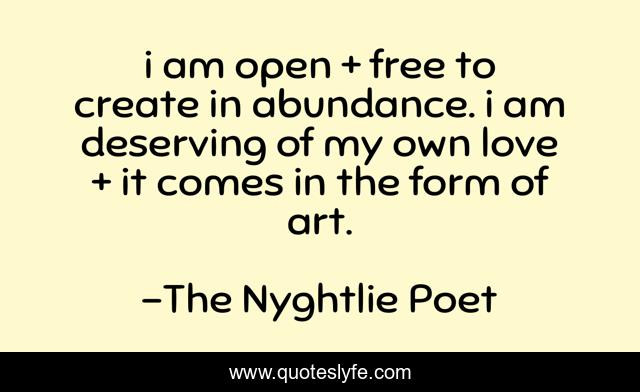 This page presents the quote "i am open + free to create in abundance. i am deserving of my own love + it comes in the form of art.". Author of this quote is The Nyghtlie Poet. This quote is about affirmations, selflove, positive-thinking,.