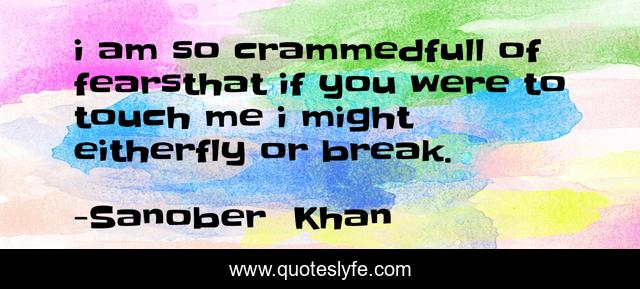 This page presents the quote "i am so crammedfull of fearsthat if you were to touch me i might eitherfly or break.". Author of this quote is Sanober Khan. This quote is about fly, quote-of-the-day, poetry, emotions, honest, break, raw, fear, set-free,.