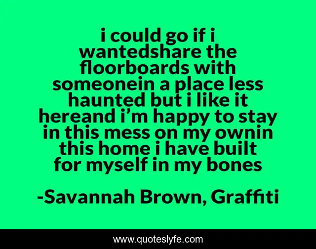This page presents the quote "i could go if i wantedshare the floorboards with someonein a place less haunted but i like it hereand i’m happy to stay in this mess on my ownin this home i have built for myself in my bones". Author of this quote is Savannah Brown, Graffiti. This quote is about loneliness, savannah-brown, poetry, real-estate, independence,.