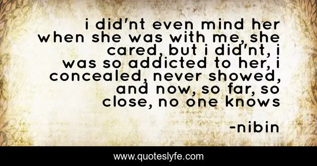 This page presents the quote "i did'nt even mind her when she was with me, she cared, but i did'nt, i was so addicted to her, i concealed, never showed, and now, so far, so close, no one knows". Author of this quote is nibin. This quote is about far, close, care,.