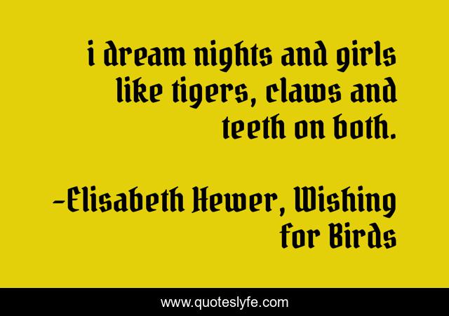This page presents the quote "i dream nights and girls like tigers, claws and teeth on both.". Author of this quote is Elisabeth Hewer, Wishing for Birds. This quote is about claws, tigers, girls,.