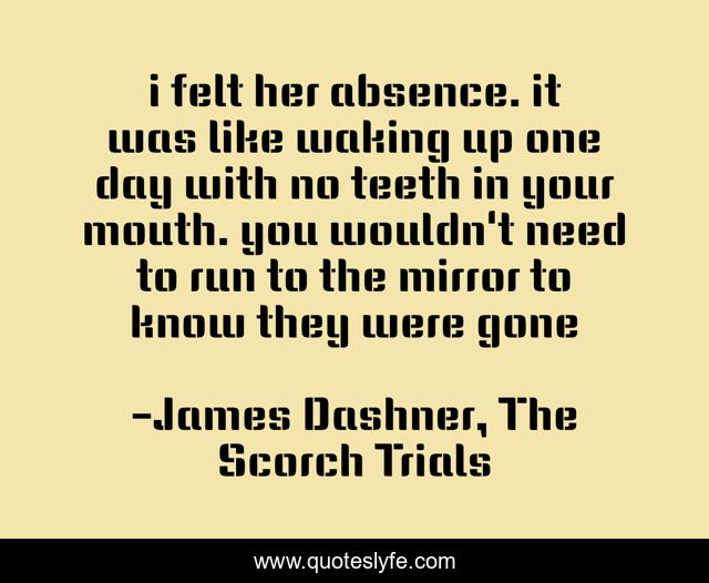 This page presents the quote "i felt her absence. it was like waking up one day with no teeth in your mouth. you wouldn't need to run to the mirror to know they were gone". Author of this quote is James Dashner, The Scorch Trials. This quote is about gone, mirror, it, one, in, need, miss, your, i-love-you,.