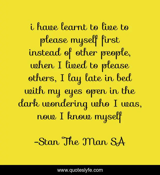 This page presents the quote "i have learnt to live to please myself first instead of other people, when I lived to please others, I lay late in bed with my eyes open in the dark wondering who I was, now I know myself". Author of this quote is Stan The Man SA. This quote is about inspirational-life, grounded, inspirational-love, inspirational-religious,.