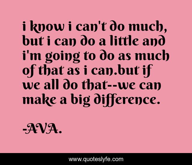 This page presents the quote "i know i can't do much, but i can do a little and i'm going to do as much of that as i can.but if we all do that--we can make a big difference.". Author of this quote is AVA.. This quote is about empowering, inspiring, positive, life, confidence, inspirational, enthusiasm,.