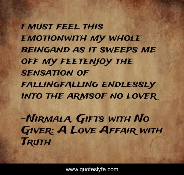This page presents the quote "i must feel this emotionwith my whole beingand as it sweeps me off my feetenjoy the sensation of fallingfalling endlessly into the armsof no lover". Author of this quote is Nirmala, Gifts with No Giver: A Love Affair with Truth. This quote is about emotion, nirmala,.