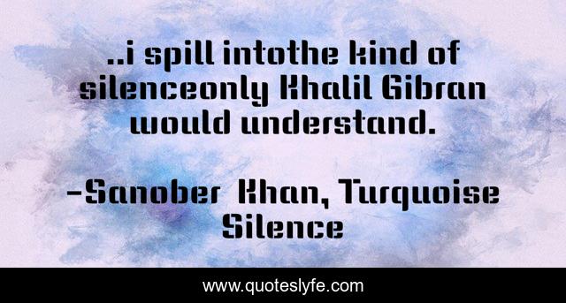 This page presents the quote "..i spill intothe kind of silenceonly Khalil Gibran would understand.". Author of this quote is Sanober Khan, Turquoise Silence. This quote is about poets, beauty, language, spill, solitude, quiet, poetry, khalil-gibran, understanding,.