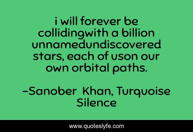 This page presents the quote "i will forever be collidingwith a billion unnamedundiscovered stars, each of uson our own orbital paths.". Author of this quote is Sanober Khan, Turquoise Silence. This quote is about silent, solitude, orbit, poetry, stargazing, galaxy, stars, night-sky, path,.