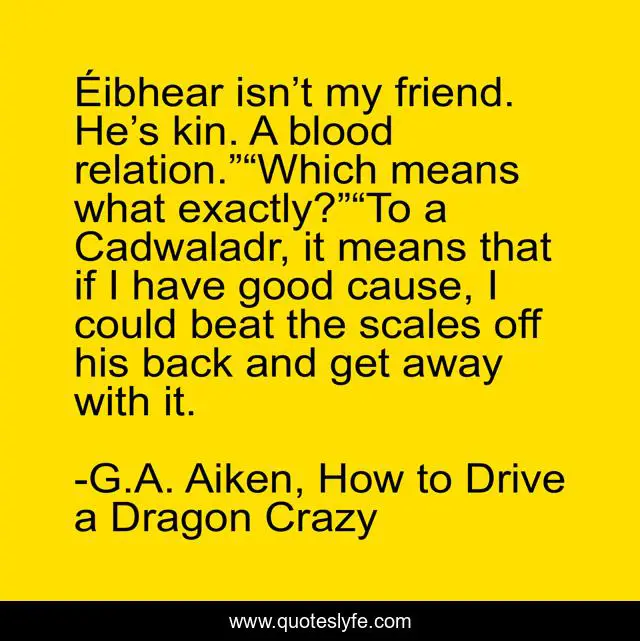 This page presents the quote "Éibhear isn’t my friend. He’s kin. A blood relation.”“Which means what exactly?”“To a Cadwaladr, it means that if I have good cause, I could beat the scales off his back and get away with it.". Author of this quote is G.A. Aiken, How to Drive a Dragon Crazy. This quote is about family, humour, kin,.