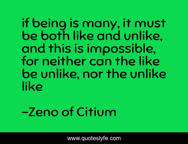 This page presents the quote "if being is many, it must be both like and unlike, and this is impossible, for neither can the like be unlike, nor the unlike like". Author of this quote is Zeno of Citium. This quote is about elea, zeno, philosophy, eleatic, greek, vedanta, determinism, hinduism, metaphysics,.