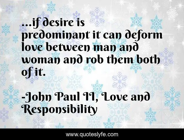 This page presents the quote "...if desire is predominant it can deform love between man and woman and rob them both of it.". Author of this quote is John Paul II, Love and Responsibility. This quote is about desire, life, love, p82, truth, affection,.