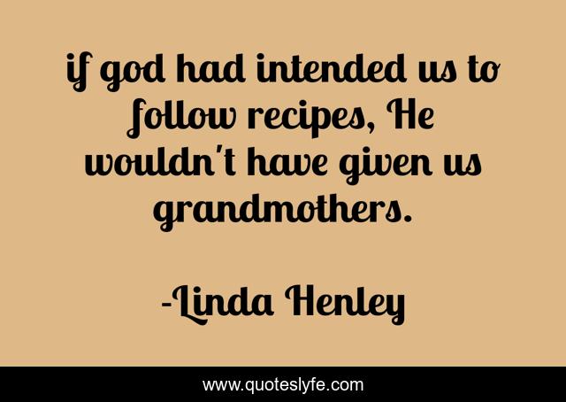 This page presents the quote "if god had intended us to follow recipes, He wouldn't have given us grandmothers.". Author of this quote is Linda Henley. This quote is about god, recipes, cooking, grandmothers,.