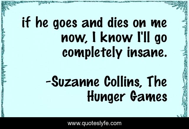 This page presents the quote "if he goes and dies on me now, I know I'll go completely insane.". Author of this quote is Suzanne Collins, The Hunger Games. This quote is about insane, die, peeta, katniss,.
