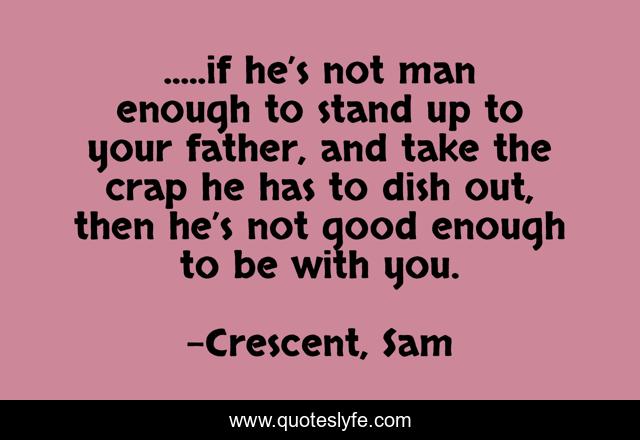 This page presents the quote ".....if he’s not man enough to stand up to your father, and take the crap he has to dish out, then he’s not good enough to be with you.". Author of this quote is Crescent, Sam. This quote is about chick-lit, erotic-literature, self-help,.