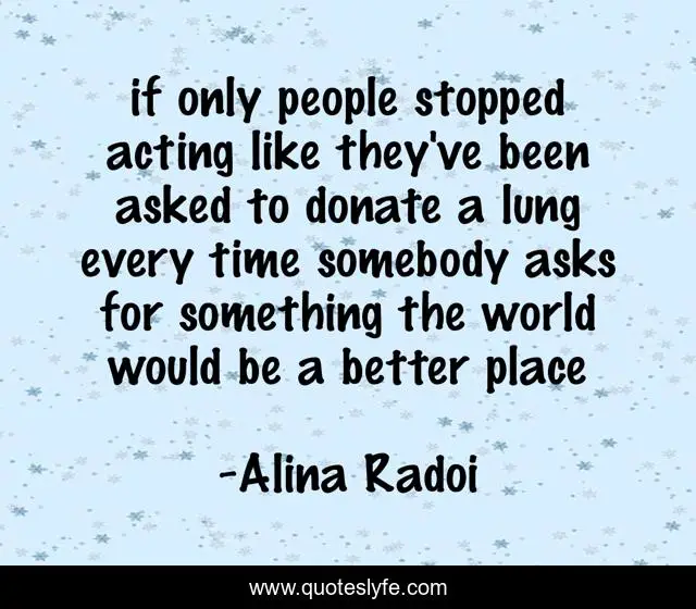 This page presents the quote "if only people stopped acting like they've been asked to donate a lung every time somebody asks for something the world would be a better place". Author of this quote is Alina Radoi. This quote is about peace, zen, wisdom, better-place, inspirational, world, enthusiasm,.