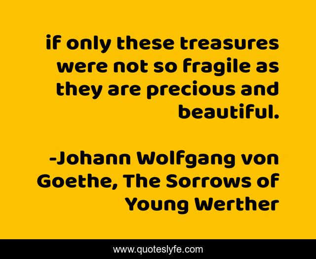 This page presents the quote "if only these treasures were not so fragile as they are precious and beautiful.". Author of this quote is Johann Wolfgang von Goethe, The Sorrows of Young Werther. This quote is about beautiful, peace-of-mind, fragile, treasures, pleasure,.