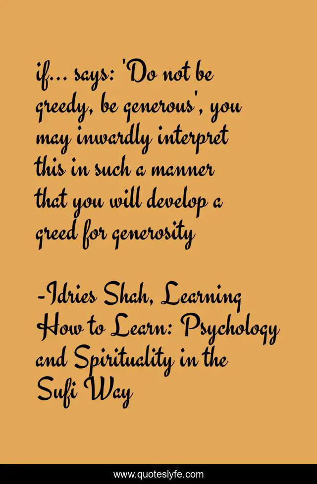 This page presents the quote "if... says: 'Do not be greedy, be generous', you may inwardly interpret this in such a manner that you will develop a greed for generosity". Author of this quote is Idries Shah, Learning How to Learn: Psychology and Spirituality in the Sufi Way. This quote is about evolution, psychology, sufism, conditioning, sufis, greed,.