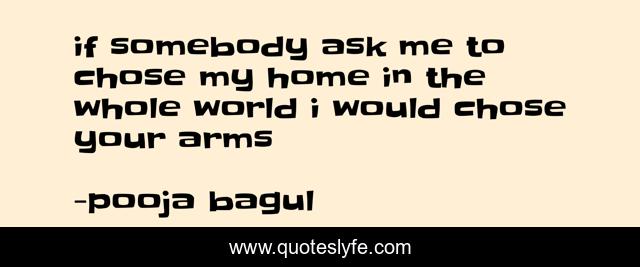 This page presents the quote "if somebody ask me to chose my home in the whole world i would chose your arms". Author of this quote is pooja bagul. This quote is about me, love, soul, affection, he,.