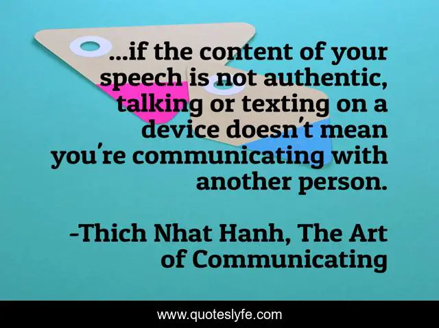 This page presents the quote "...if the content of your speech is not authentic, talking or texting on a device doesn't mean you're communicating with another person.". Author of this quote is Thich Nhat Hanh, The Art of Communicating. .
