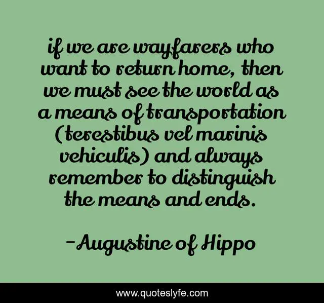 This page presents the quote "if we are wayfarers who want to return home, then we must see the world as a means of transportation (terestibus vel marinis vehiculis) and always remember to distinguish the means and ends.". Author of this quote is Augustine of Hippo. .