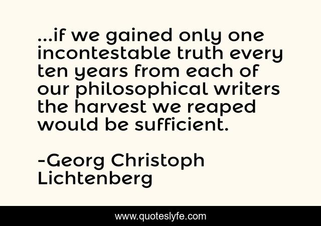 This page presents the quote "...if we gained only one incontestable truth every ten years from each of our philosophical writers the harvest we reaped would be sufficient.". Author of this quote is Georg Christoph Lichtenberg. This quote is about philosophy, truth,.