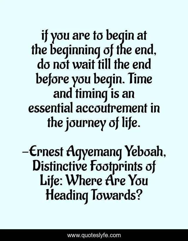 This page presents the quote "if you are to begin at the beginning of the end, do not wait till the end before you begin. Time and timing is an essential accoutrement in the journey of life.". Author of this quote is Ernest Agyemang Yeboah, Distinctive Footprints of Life: Where Are You Heading Towards?. This quote is about life, wisdom, purpose, inspirational, time, timing, enthusiasm,.