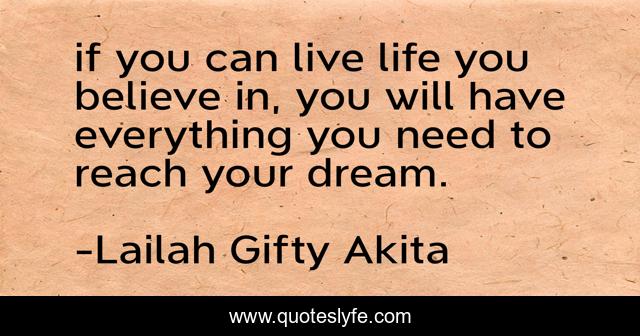 This page presents the quote "if you can live life you believe in, you will have everything you need to reach your dream.". Author of this quote is Lailah Gifty Akita. This quote is about belief, believe-and-achieve, believe-in-yourself, dreaming, believe, dreams-inspirational, dream, dreams,.