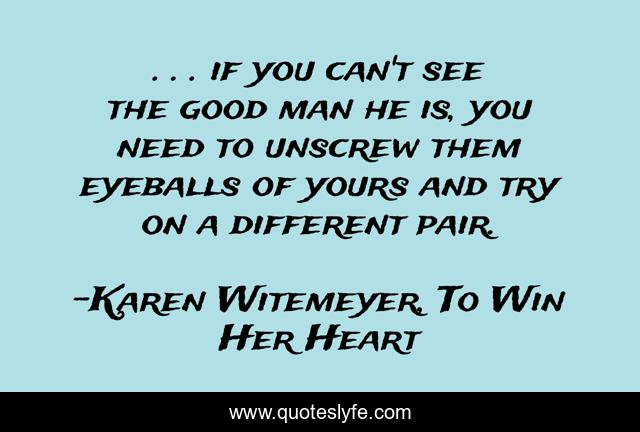 This page presents the quote ". . . if you can't see the good man he is, you need to unscrew them eyeballs of yours and try on a different pair.". Author of this quote is Karen Witemeyer, To Win Her Heart. This quote is about romance, enthusiasm, christian, historical-romance, inspirational,.