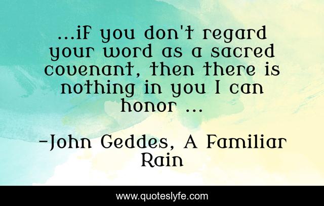 This page presents the quote "...if you don't regard your word as a sacred covenant, then there is nothing in you I can honor ...". Author of this quote is John Geddes, A Familiar Rain. This quote is about covenant, wise-words, scared, promise, truth, honor,.
