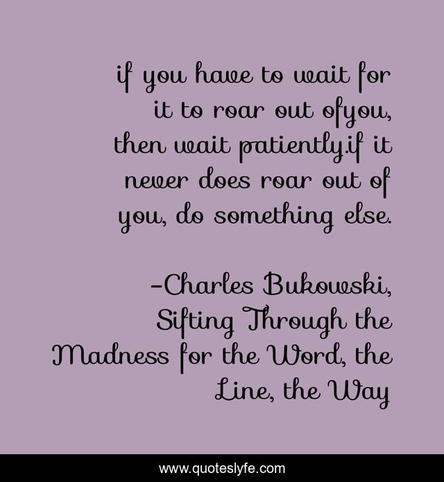 This page presents the quote "if you have to wait for it to roar out ofyou, then wait patiently.if it never does roar out of you, do something else.". Author of this quote is Charles Bukowski, Sifting Through the Madness for the Word, the Line, the Way. This quote is about art, inspired, writing, passion, patient, passionate, inspiration,.