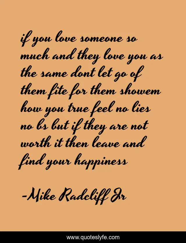 This page presents the quote "if you love someone so much and they love you as the same dont let go of them fite for them showem how you true feel no lies no bs but if they are not worth it then leave and find your happiness". Author of this quote is Mike Radcliff Jr. This quote is about enthusiasm, life, sadness, inspirational, happy,.