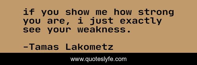 This page presents the quote "if you show me how strong you are, i just exactly see your weakness.". Author of this quote is Tamas Lakometz. This quote is about weakness, strong, weak,.