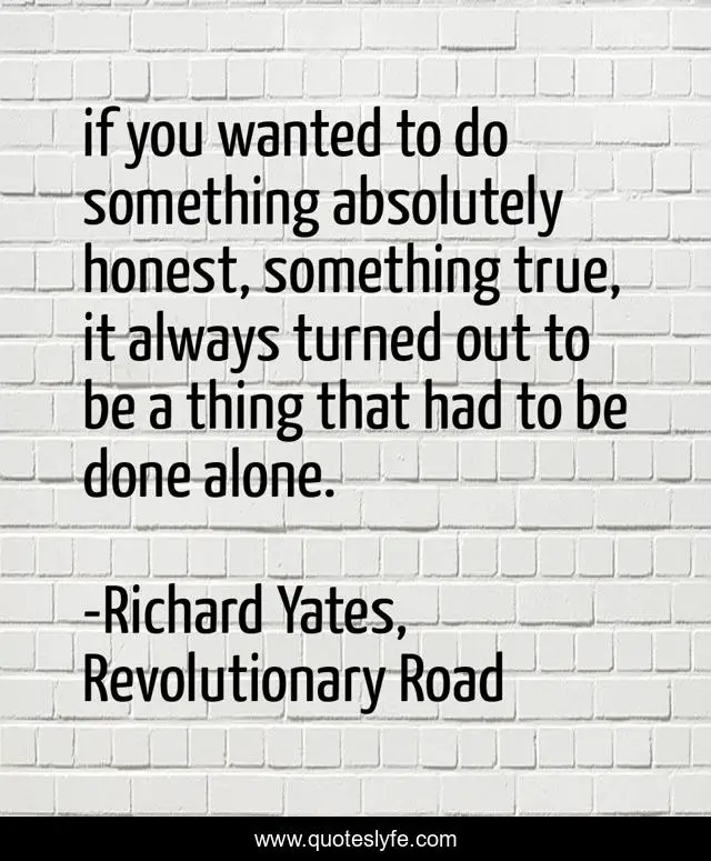 This page presents the quote "if you wanted to do something absolutely honest, something true, it always turned out to be a thing that had to be done alone.". Author of this quote is Richard Yates, Revolutionary Road. This quote is about alone, honesty, yates,.