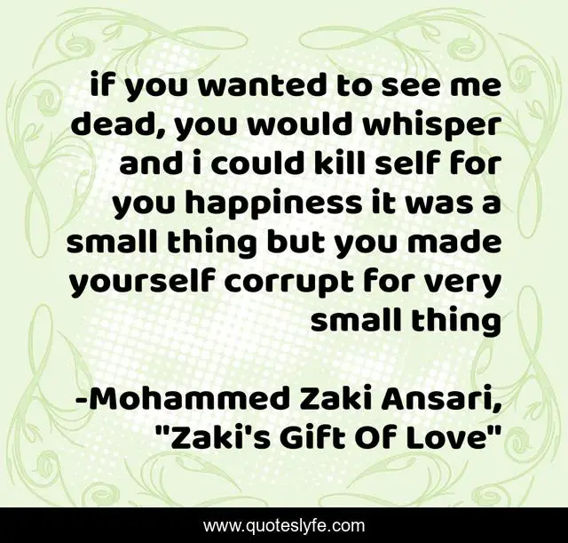 This page presents the quote "if you wanted to see me dead, you would whisper and i could kill self for you happiness it was a small thing but you made yourself corrupt for very small thing". Author of this quote is Mohammed Zaki Ansari, "Zaki's Gift Of Love". This quote is about betrayed, love, affection, hurt,.
