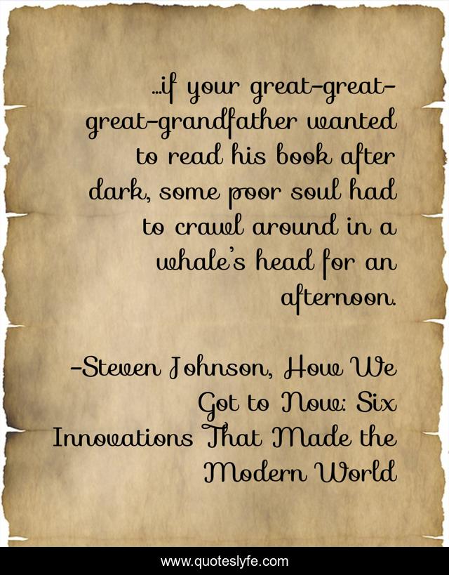 This page presents the quote "...if your great-great-great-grandfather wanted to read his book after dark, some poor soul had to crawl around in a whale’s head for an afternoon.". Author of this quote is Steven Johnson, How We Got to Now: Six Innovations That Made the Modern World. This quote is about artificial-light, innovation,.