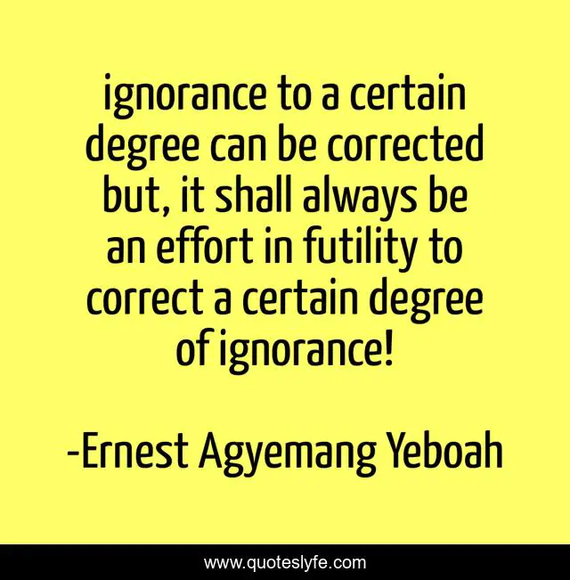 This page presents the quote "ignorance to a certain degree can be corrected but, it shall always be an effort in futility to correct a certain degree of ignorance!". Author of this quote is Ernest Agyemang Yeboah. This quote is about food-for-thought, life, ignore-ignorance, ignorance, do-what-matters, do-the-right-things,.