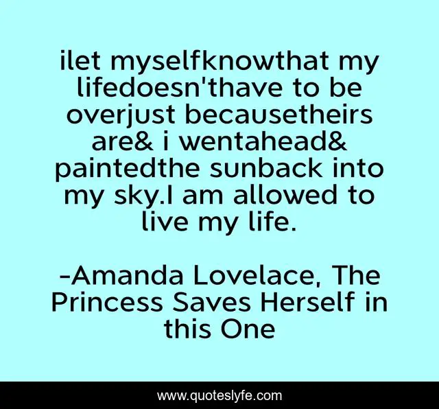 This page presents the quote "ilet myselfknowthat my lifedoesn'thave to be overjust becausetheirs are& i wentahead& paintedthe sunback into my sky.I am allowed to live my life.". Author of this quote is Amanda Lovelace, The Princess Saves Herself in this One. This quote is about loss, life, death, love, family, sun, poetry, grief, girl,.