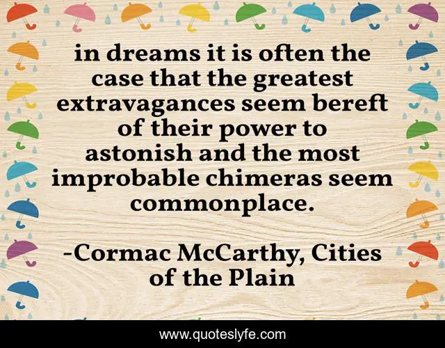 This page presents the quote "in dreams it is often the case that the greatest extravagances seem bereft of their power to astonish and the most improbable chimeras seem commonplace.". Author of this quote is Cormac McCarthy, Cities of the Plain. .