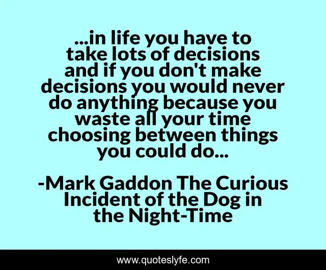 This page presents the quote "...in life you have to take lots of decisions and if you don't make decisions you would never do anything because you waste all your time choosing between things you could do...". Author of this quote is Mark Gaddon The Curious Incident of the Dog in the Night-Time. .