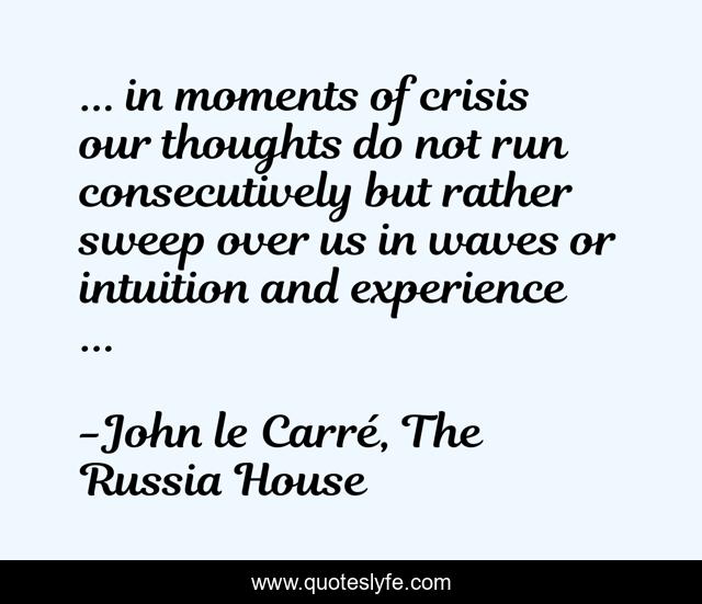 This page presents the quote "... in moments of crisis our thoughts do not run consecutively but rather sweep over us in waves or intuition and experience ...". Author of this quote is John le Carré, The Russia House. This quote is about thinking, intuition, crisis, experience,.
