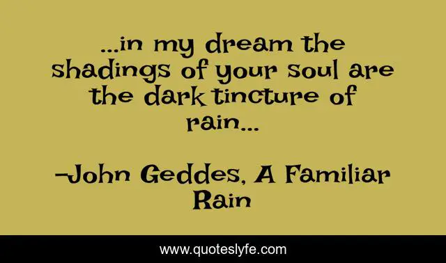 This page presents the quote "...in my dream the shadings of your soul are the dark tincture of rain...". Author of this quote is John Geddes, A Familiar Rain. This quote is about poetry, sadness, soul, rain, darkness,.