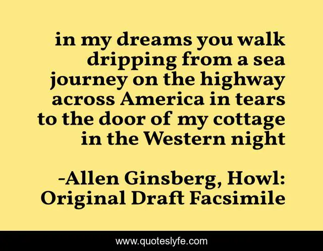 This page presents the quote "in my dreams you walk dripping from a sea journey on the highway across America in tears to the door of my cottage in the Western night". Author of this quote is Allen Ginsberg, Howl: Original Draft Facsimile. This quote is about america, howl,.