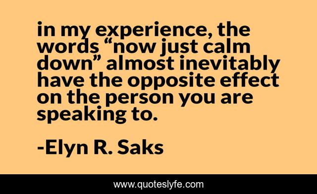 This page presents the quote "in my experience, the words “now just calm down” almost inevitably have the opposite effect on the person you are speaking to.". Author of this quote is Elyn R. Saks. This quote is about panic-attacks, anxiety, panic-and-anxiety, panicky,.