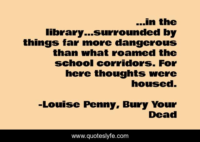 This page presents the quote "…in the library…surrounded by things far more dangerous than what roamed the school corridors. For here thoughts were housed.". Author of this quote is Louise Penny, Bury Your Dead. This quote is about library, thoughts, dangers,.