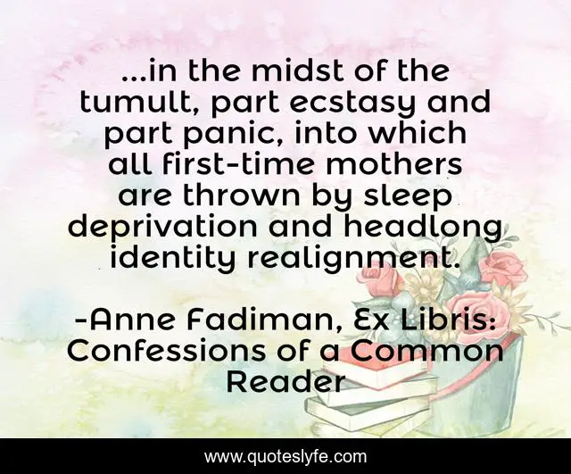 This page presents the quote "...in the midst of the tumult, part ecstasy and part panic, into which all first-time mothers are thrown by sleep deprivation and headlong identity realignment.". Author of this quote is Anne Fadiman, Ex Libris: Confessions of a Common Reader. .