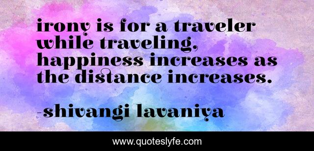 This page presents the quote "irony is for a traveler while traveling, happiness increases as the distance increases.". Author of this quote is shivangi lavaniya. This quote is about distance, irony, increases, traveling, traveler, happiness,.