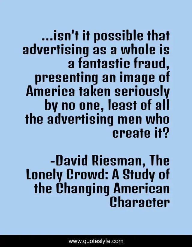 This page presents the quote "...isn't it possible that advertising as a whole is a fantastic fraud, presenting an image of America taken seriously by no one, least of all the advertising men who create it?". Author of this quote is David Riesman, The Lonely Crowd: A Study of the Changing American Character. This quote is about media, advertising, society,.