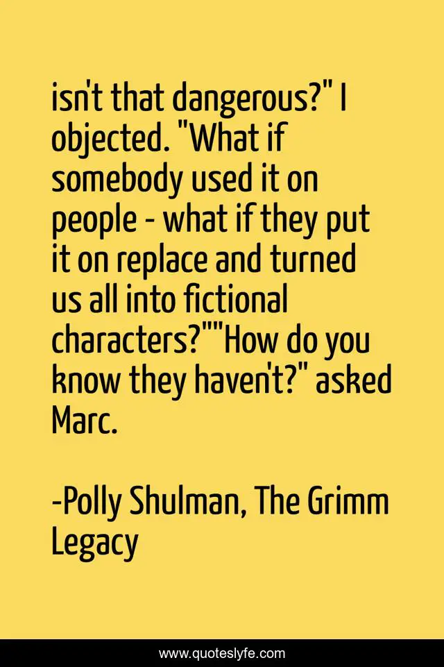 This page presents the quote "isn't that dangerous?" I objected. "What if somebody used it on people - what if they put it on replace and turned us all into fictional characters?""How do you know they haven't?" asked Marc.". Author of this quote is Polly Shulman, The Grimm Legacy. This quote is about surreal, magical-devices, magic,.