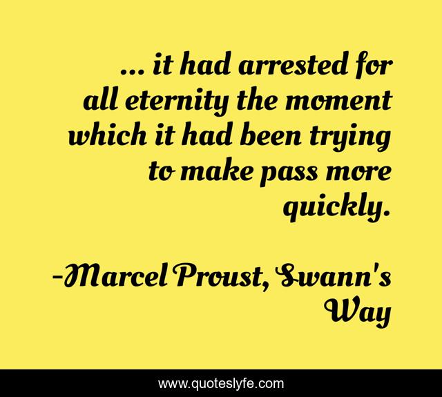 This page presents the quote "... it had arrested for all eternity the moment which it had been trying to make pass more quickly.". Author of this quote is Marcel Proust, Swann's Way. This quote is about moment, life, description,.